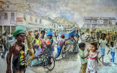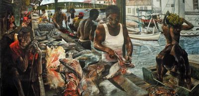 The painting’s namesake is the old man forefront on the leftmost side. A mariner who has seen and done it all, his experiences leave him with a wealth of stories and experiences. He could be at home relaxing on his chair or he could be sleeping off the high noon heat, but instead he chooses to come to the fish market in Belize City. He takes in the scent of gutted groupers, the feel of the coarse, corroded wood of the benches, the smooth and bright colors of the conch shells. This was his life. This still is his life. It will be his life until the day he dies and he would have it no other way. How many of us can claim to be so at peace with our world as Jimmy Hines?